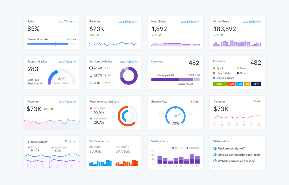 Graphs UI Kit for Dashboards is a great starter kit for building admin dashboards with the most perfect, unique and beautiful charts in E-commerce, Analytics, Stocks and many more apps.